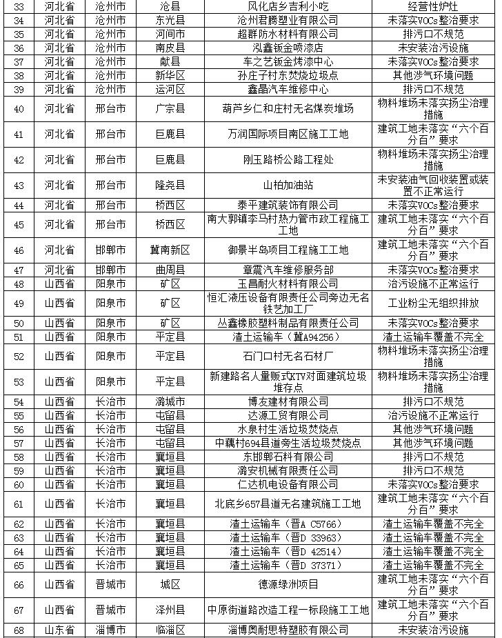 其中,河北省石家庄市元氏县1家(排气筒高度不足23米),沧州市运河区1家(排气筒高度不足15米)、河间市1家(排气筒未设置监测平台);山西省长治市襄垣县2家(排气筒高度不足15米)、潞城市1家(排气筒高度不足15米);山东省滨州市沾化区1家(排气筒高度不足15米);河南省郑州市中牟县1家(排气筒高度不足30米)废气排放口设置未达到环评要求。